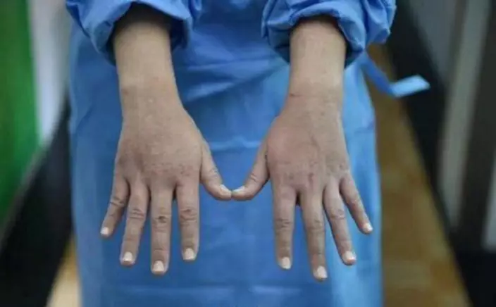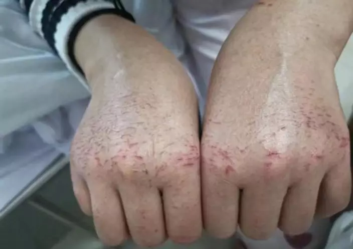 由於經常接觸消毒酒精,胡的雙手「爆擦」,更冒出絲絲血跡(網上圖片)