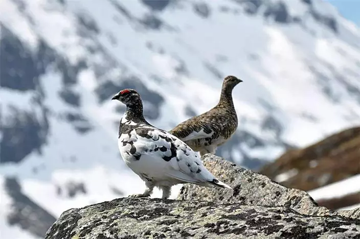 到了6月份,阿爾泰山上的積雪開始融化,植被開始萌芽,巖雷鳥就會脫下冬裝,換上春夏裝,褪掉雪白的厚實羽毛,長出與周圍巖石顏色極為相似的麻灰色羽毛。春秋季,巖雷鳥會局部換羽,春天它的頭、頸和胸部換成有棕色橫斑的春羽,秋季會變成與枯黃色植被相似的麻黃色。