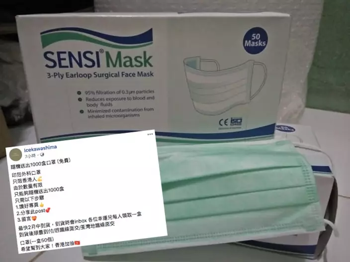 網民Icekawashima在社交專頁表示只需讚好專頁,分享帖文並留言,就可參與抽口罩,1000盒印尼外科口罩預計最快2月中到貨,到貨時會inbox各位幸運兒每人領取一盒,到貨後順豐到付、西鐵線面交或荃灣地鐵線面交