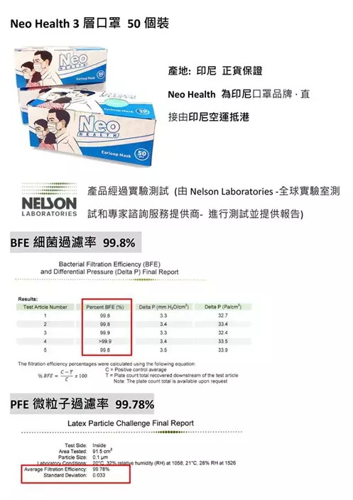 日本城今日(4日)將有關「Neo Health 3層口罩50個裝」的參考資料發布上facebook,指生產地是印尼,產品經Nelson Laboratories全球實驗室測試,和專家諮商服務提供這進行實驗測試。口罩也有BFE細菌過濾99.8%,PFE微粒子過濾率99.78%。