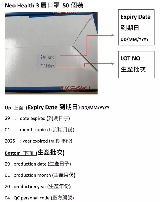 第三:生產日期標籤難以明白,口罩包裝上有一串數字,難以分辨生產日期與有效日期,更有部分包裝印有「2001」,令到網民質疑是否2001年生產,指有效期已過。
