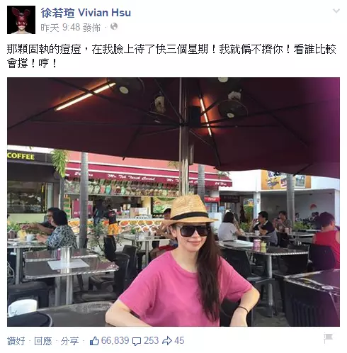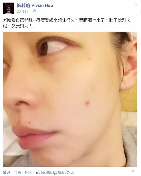 徐若瑄今日在Facebook貼上一張側臉照,臉上明顯的痘痘讓她直呼:「痘痘看起來想住很久、黑眼圈也來了、肚子比別人餓、又比別人大⋯」