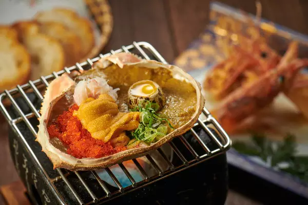 燒物 – 雲丹甲羅燒。 集合香濃蟹膏、鵪鶉蛋、爽脆蟹籽及絲絲蟹肉,再加上同是港人最愛的海膽,每一口盡是豐富滋味,令人大滿足!客人更可再醇厚的蟹膏配上烘脆了的法包多士,或香炸的牡丹蝦頭,又是一輪幸福的味覺享受!(本網記者攝)