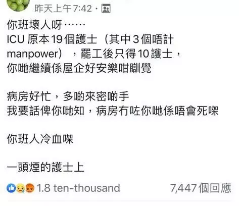 消防員:「現時一個護士照顧20個BB,在深切治療部的BB等着你們會去照顧啊!你們竟然咁盲目當睇唔到,不去照顧BB!唔照顧病人!」