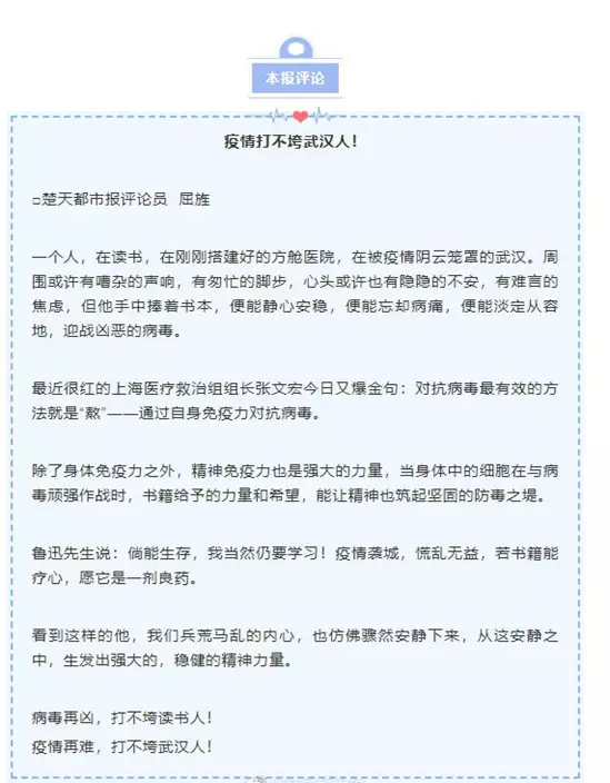 《楚天都市報》評論員屈旌以散文的方式形容他的不凡,「周遭或許有嘈雜的聲響,有匆忙的腳步,心頭或許也有隱隱的不安,有難言的焦慮,但他手中捧著書本,便能靜心安穩,便能忘卻病痛,便能淡定從容地,迎戰兇惡的病毒。」