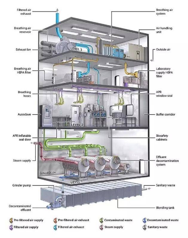 P4實驗室作為最高級別的生物安全實驗室,是應對高危險性、且無法預防和治療的烈性病毒的利器。P4實驗室一般為一棟獨立的建築物,如與其他級別生物實驗室共用建築物,也需要在建築物中佔據獨立的隔離區域,並與附近的其他建築物完全隔離。在常見的四層結構中,一層為污水處理與保障設備,二層為核心實驗區,三層為排風管道過濾層,四層為空調設備與送排風管道。