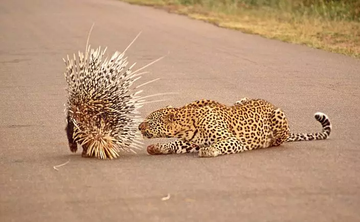 41歲的Lisl Moolman在南非一個國家公園觀賞,期間看到一隻年幼豹子在草叢休息,此時路邊出現了一隻鳳箭豬。豹子可能太肚餓,看到獵物後悄悄靠近。