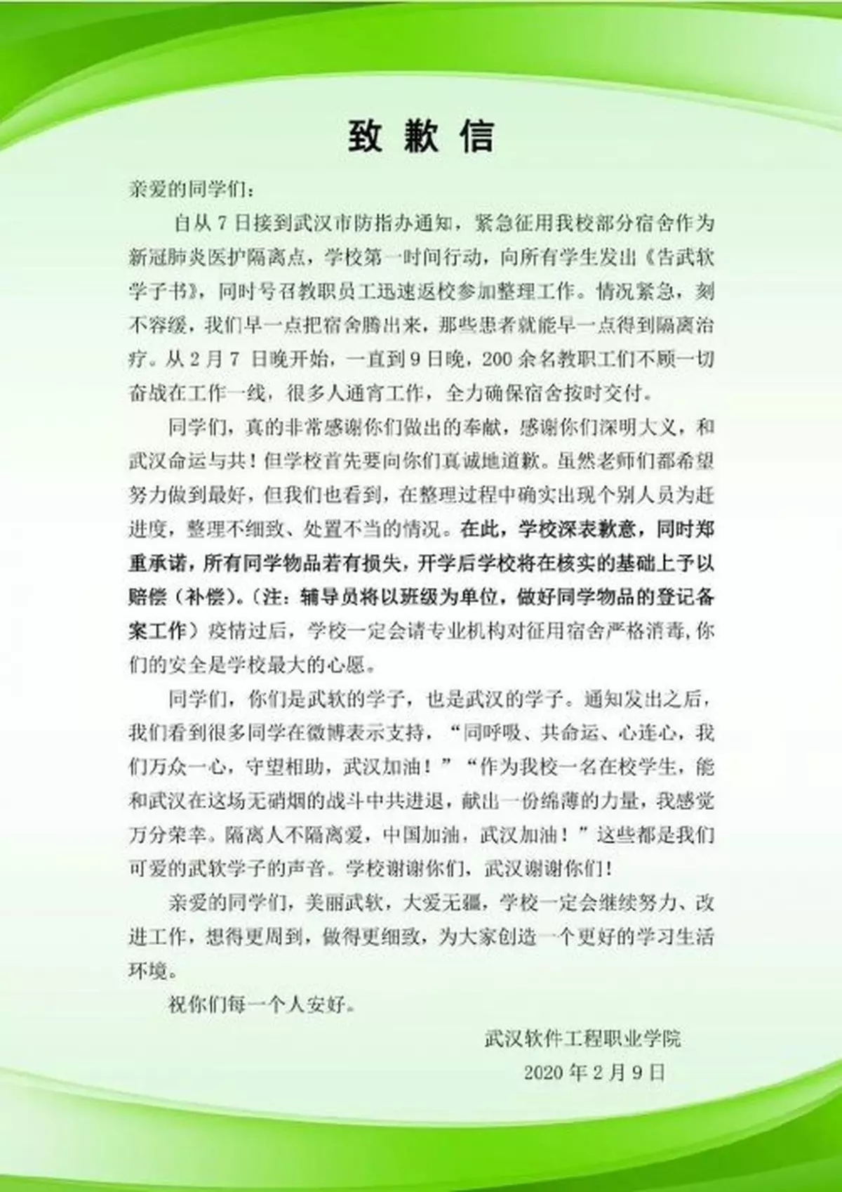 今天(2月10日)凌晨2時許,武漢軟體工程職業學院官微發佈道歉信稱,7日接到武漢市防指辦通知,緊急徵用部分宿舍作為新冠肺炎醫護隔離點。該致歉信寫道,「雖然老師們都希望努力做到最好,但我們也看到,在整理過程中確實出現個別人員為趕進度,整理不細緻、處置不當的情況。」