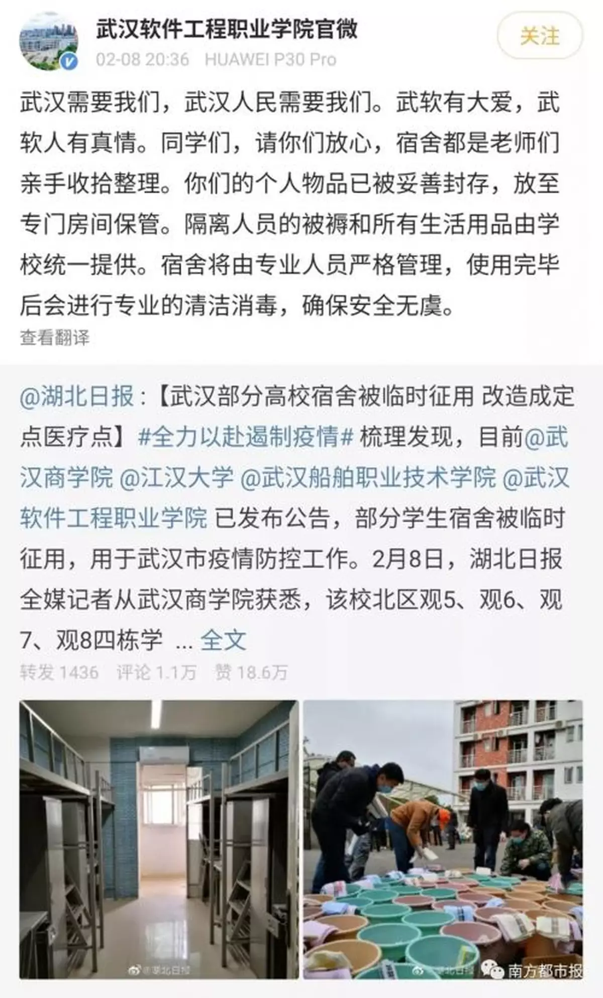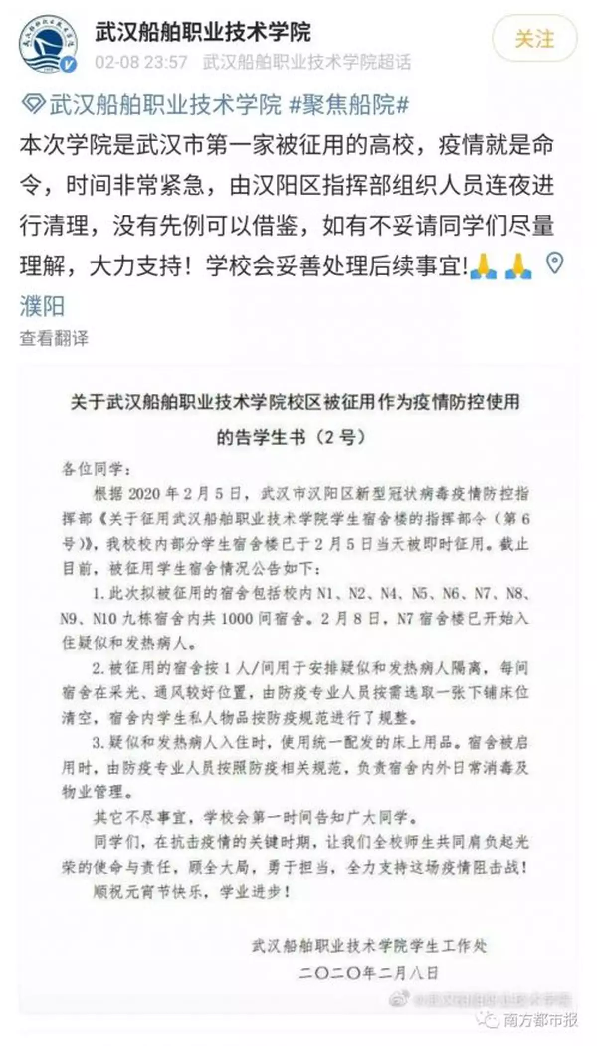 在前天(2月8日)18時16分及23時57分,武漢船舶職業技術學院兩次通過官微發佈「告學生書」,並在微博中表示:該校是武漢市第一家被徵用的高校,疫情就是命令,時間非常緊急。「由漢陽區指揮部組織人員連夜進行清理,沒有先例可以借鑒。如有不妥請同學們盡量理解,大力支持。學校會妥善處理後續事宜。」