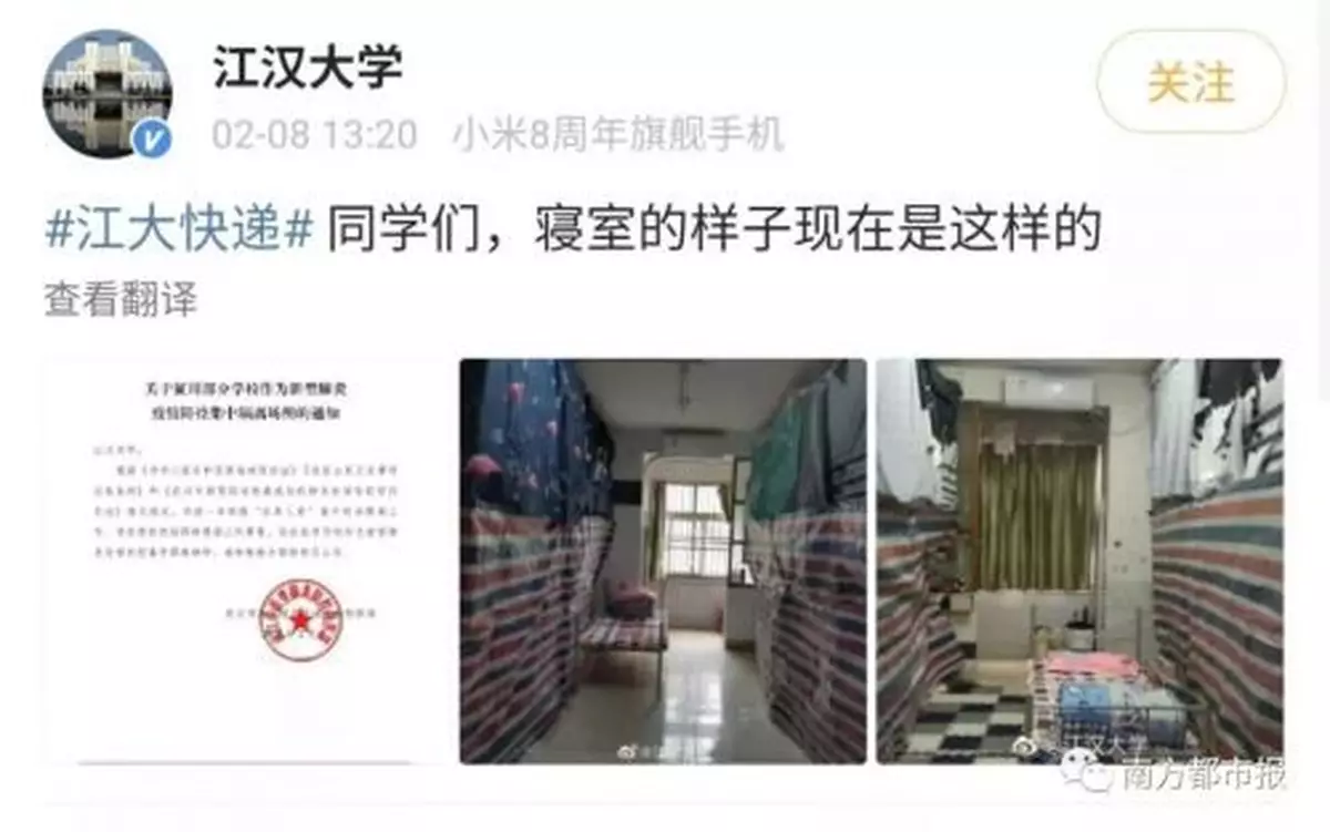 不到一個小時後,8日13時20分,江漢大學官方微博發佈改造後的宿舍情況。其發佈圖片顯示,學生床鋪和書桌等被塑料布隔離,宿舍中間額外放置一張單人床等用於收治患者。不少網友在評論區為校方做法點贊,也有人擔心該隔離方法未必完善。