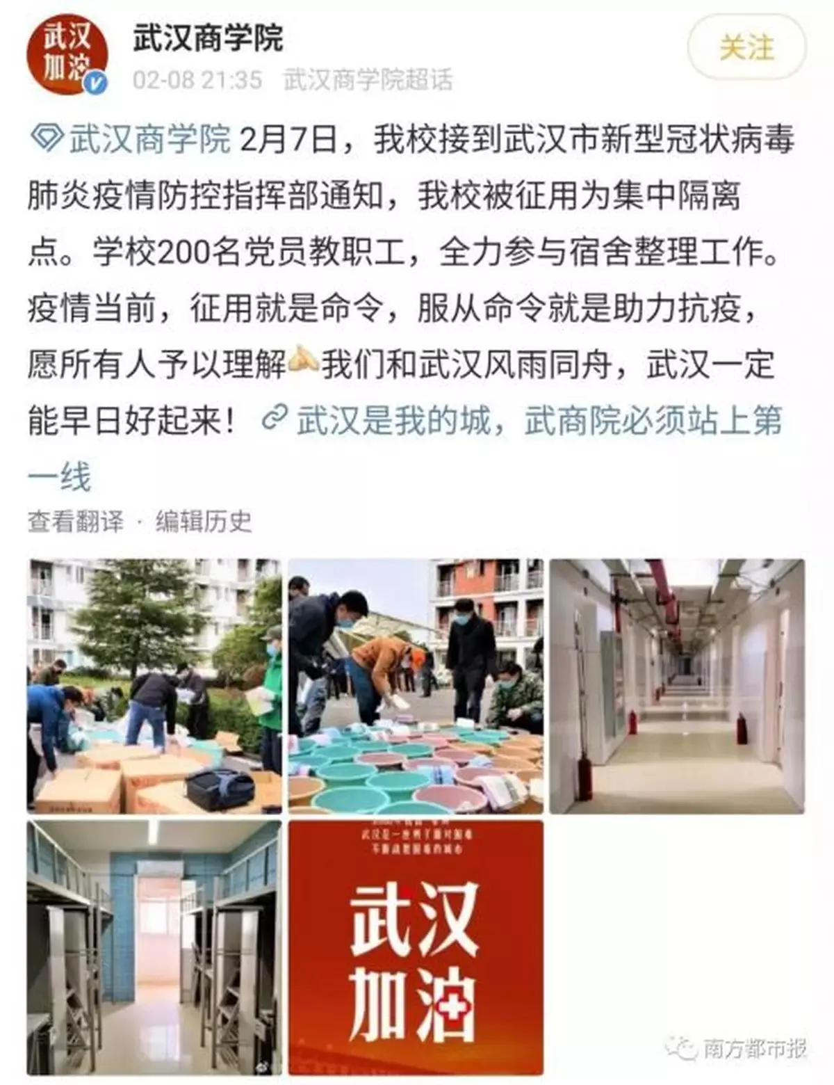 前天(2月8日)21時35分,武漢商學院官方微博發佈消息稱,2月7日,該校接到武漢市新型冠狀病毒肺炎疫情防控指揮部通知,被徵用為集中隔離點。學校200名黨員教職工,全力參與宿舍整理工作。