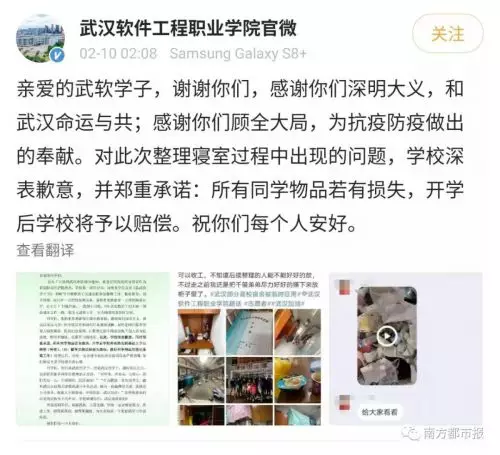 校方稱,對同學物品處置不當的情況深表歉意,同時鄭重承諾,「所有同學物品若有損失,開學後學校將在核實的基礎上予以賠償(補償)。疫情過後,學校一定會請專業機構對徵用宿舍嚴格消毒」。