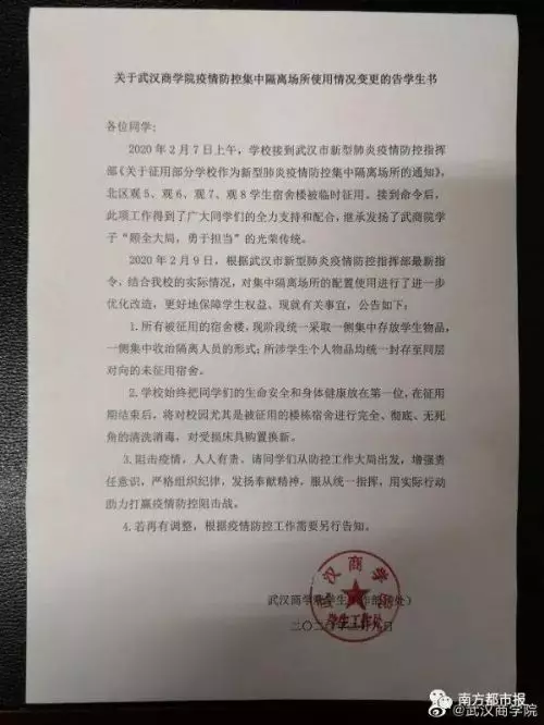 昨天(2月9日)20時55分,武漢商學院再次發佈「告學生書」,稱「對集中隔離場所的配置使用進行了進一步優化改造,更好地保障學生權益」。據告知書,所有被徵用的宿舍樓,現階段統一採取樓層一側房間集中存放學生物品,樓層另一側房間集中收治隔離人員的形式。所涉學生個人物品均統一封存至同層對向的未徵用宿舍進行保管。