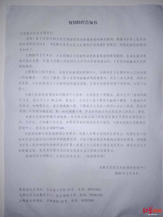 記者看到,武侯區疾控中心在2月8日針對這個情況發佈了一份《疫情防控告知書》:2020年2月8日,玉潔苑小區確診3名新型冠狀病毒感染的肺炎病例,系湖北探親感染返蓉後發病,目前3名病人均在四川大學華西醫院隔離治療,1名密切接觸者在醫院隔離排查。同時根據流行病學規定,武侯區疾病預防控制中心、玉林社區衛生服務中心已對該病人的接觸者進行了排查,除1名密切接觸者隔離排查外,其餘人尚無異常,同時對其家庭、小區院落進行了全面徹底的清潔消毒,左鄰右舍居家環境不受影響,大家不必擔心。