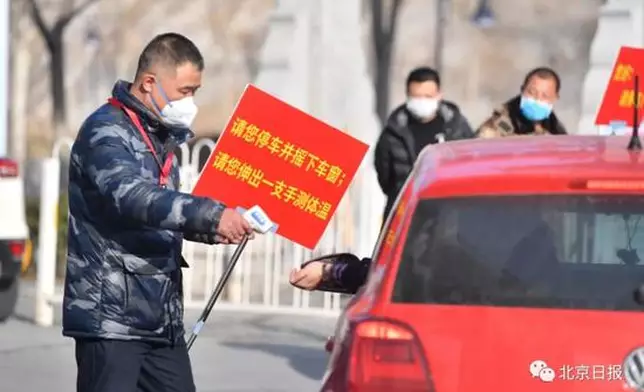 2月10日,在北京朝陽區高碑店鄉半壁店村西店社區,黨員們志願者們高舉提示牌「溫馨無聲」提醒進入人員進行檢查。