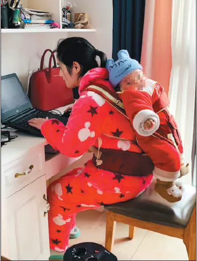 蔣欣師是馬上消費金融客戶體驗部服務設計師,也是一位軍嫂。公婆到重慶後於房間內隔離,老公初一歸隊。2月3日,公司全體員工線上復工,蔣欣師就把寶寶背在身上。由於寶寶還不能完全坐著不倒,蔣欣師就買了一個護欄放地上,讓寶寶在裏面玩。「我的腳隨時撥弄一下,讓他感覺到我還在。」