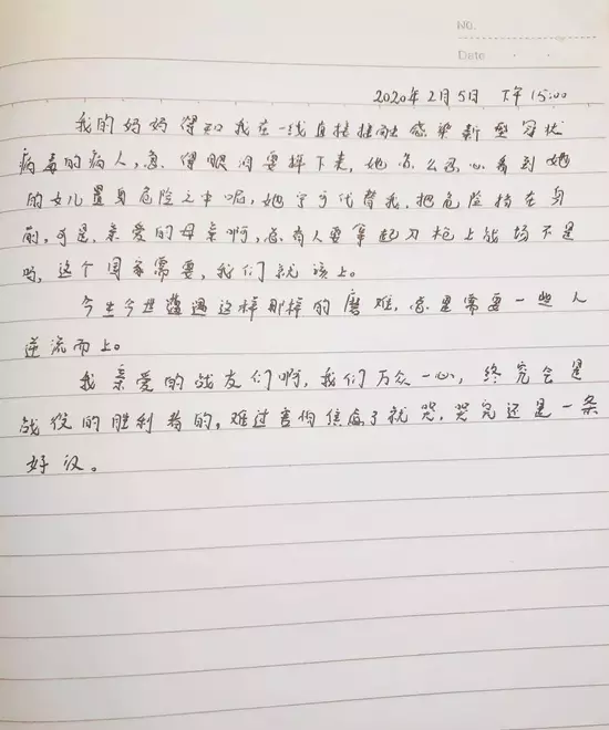 她在日記中寫道,“我的媽媽得知我在一線直接接觸感染新型冠狀病毒肺炎的病人,急得眼淚要掉下來,她怎麼忍心看到她的女兒置身危險中呢,她寧可代替我,把危險擋在她的身前。