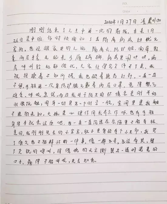 黃杉在日記里寫下第一次進隔離病房工作時的感受,「也許是身體還有些虛弱吧,我被推搡著有些不知所措,跟不上大家的節奏,我跟著他們換藥打針,一直不停。可能是第一次穿防護服吧,覺得憋氣難受,呼吸急促,還有些作嘔,這可能是身體本就未還原吧。是的,我剛剛失去的小寶寶,肚子裏曾經有個小生命,我哭了很久也不能釋懷的一件事……」