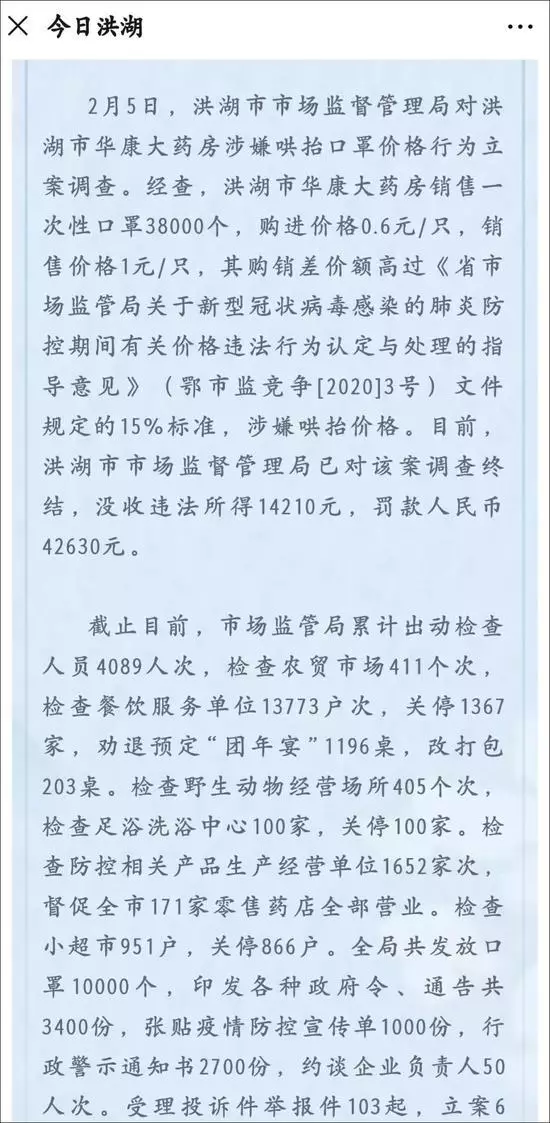 2月5日,洪湖市市場監督管理局對洪湖市華康大藥房涉嫌哄抬口罩價格行為立案調查。經查,洪湖市華康大藥房銷售一次性口罩38000個,購進價格0.6元/只,銷售價格1元/只,其購銷差價額高過《省市場監管局關於新型冠狀病毒感染的肺炎防控期間有關價格違法行為認定與處理的指導意見》(鄂市監競爭[2020]3號)文件規定的15%標準,涉嫌哄抬價格。目前,洪湖市市場監督管理局已對該案調查終結,沒收違法所得14210元,罰款人民幣42630元。