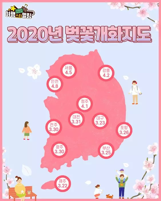 根據韓網上公開的花期預測,最南部的濟州島會首先踏入櫻花的季節,在3月22日左右就會開花。而中部的大邱也不輸蝕,預計23日就可以開始賞櫻。隨後便到25日的釜山、26日的浦項、30日的光州和全州、31日的大田、1日的清州。