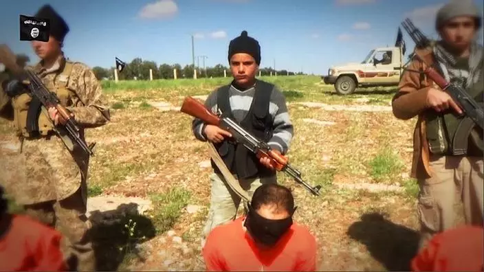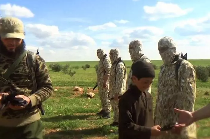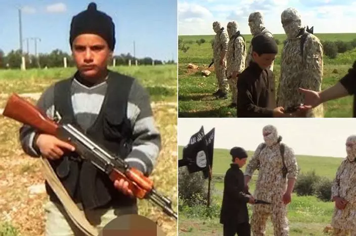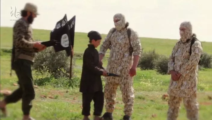 遜尼派極端組織「伊斯蘭國」(IS)不斷招攬兒童訓練娃娃兵,組織發佈最新片段,有幾個手持武器的男童將八名什葉派穆斯林人質押到野外,再交給劊子手處決。