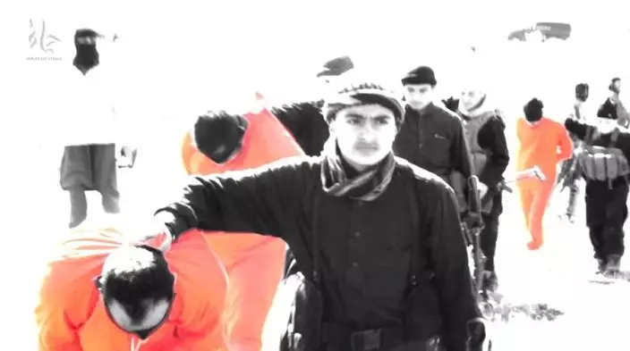 其中一個穿著黑衣的男童面帶微笑,將刀逐把交給劊子手。有劊子手在片段指稱,八名什葉派穆斯林是不純潔的異教徒。