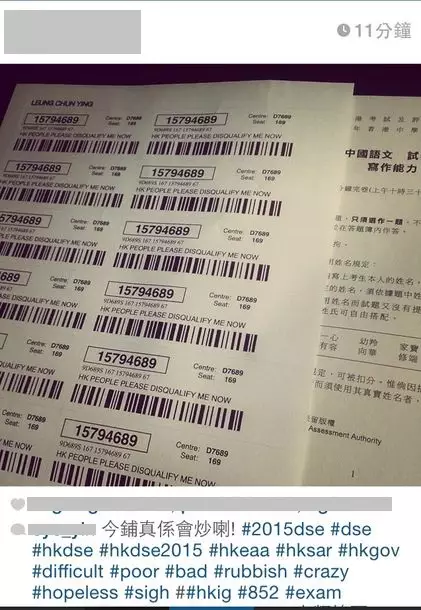 照片所見,在一份中國語文寫作能力考卷上,有一張Barcode貼紙,考生姓名位置見到印有「LEUNG CHUN YING」、試場編號是「D7689」,而科目就是「HK PEOPLE PLEASE DISQUALIFY ME NOW」,但照片是否在試場內拍攝則無從稽考。