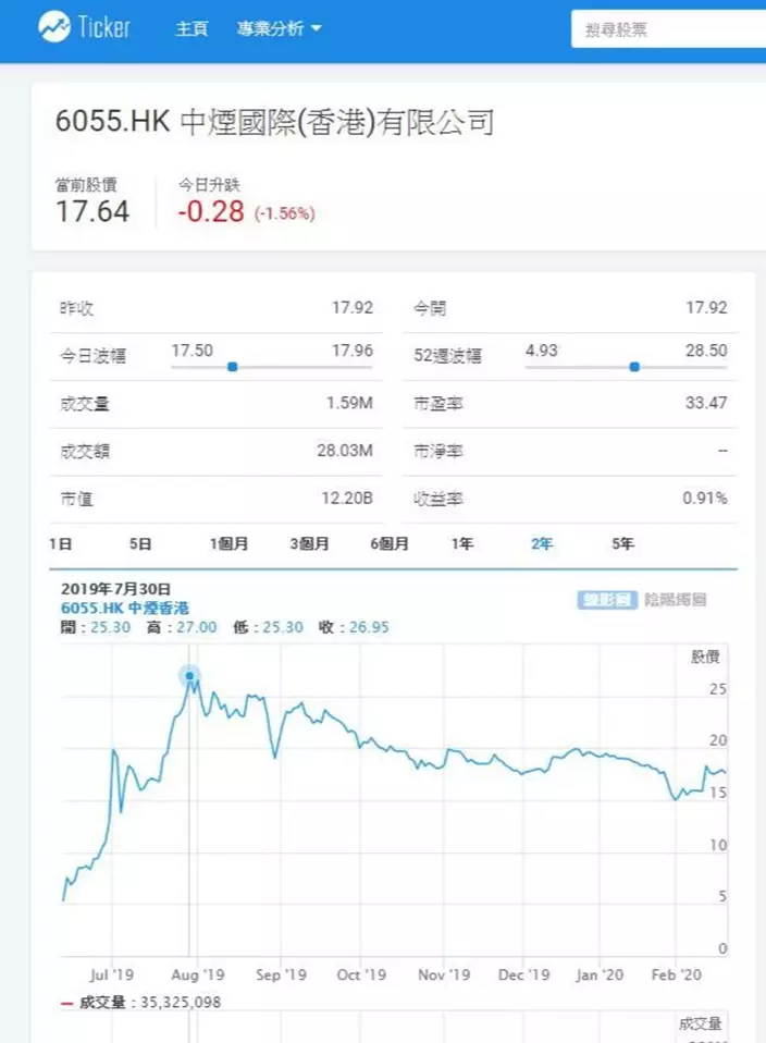 去年6月以4.88元招股上市,融資8億多元,不足一個月後,股價已大幅炒高近5倍至28.5元,不過,去年8月中煙香港財報出來後,股價一路下挫,截止2月14日收盤,中煙香港股價在17.5元,跌幅38%。