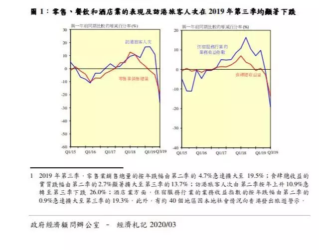 經濟扎記由政府首席經濟師侯家俊及高級經濟師梁栢豪撰寫,根據客觀數據,粗略推算零售、餐飲和酒店業的業務,以及訪港旅客的其他消費開支可能因有關事件引致的額外跌幅所帶來的經濟損失。推算2019 年第三季經濟按年負增長2.9%當中,有約2個百分點,相信可歸因於這些行業所受到的衝擊。