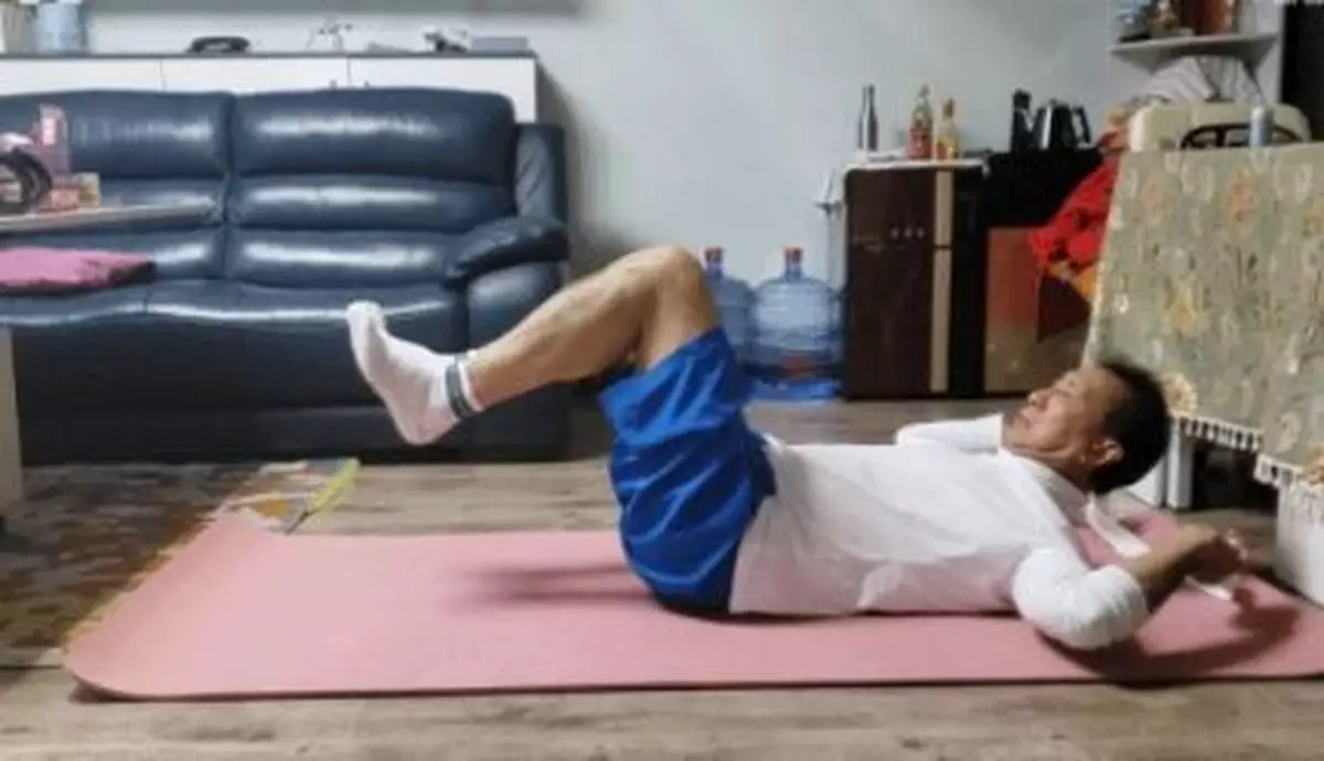 現在躺在瑜伽墊,屈膝提起雙腿,雙手拿著一條布帶或者類似東西,調整適當長度,要領是上身起來一定高度,把帶子揮過雙腳,之後上身躺平,再上身起來,同時把布帶經過腳部繞回頭部以上,像跳繩一樣。