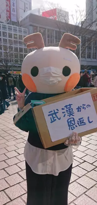 新冠肺炎衝擊日本,截至目前為止,境內確診有214個,有32人治愈,共4人死亡。在疫情加劇以及花粉季的雙重打擊之下,當地民眾也開始搶購口罩。23日,有網友分享一張攝於涉谷街頭的照片,一名穿著小鹿布偶裝的女子正在派發口罩,箱子上更寫有「來自武漢的報恩」。