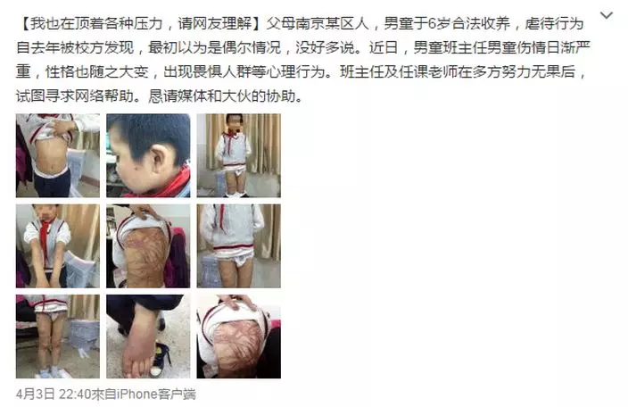 網友「朝廷半日閑」爆料指,父母是南京人,6歲時被合法收養。男童所讀的學校去年發現男童已有被虐待情況,但起初以為只是偶爾並無追究,但男童班主任近日發現他傷勢日漸嚴重,性格亦大變,出現畏懼人群等行為,於是拍照並上網尋求幫助。