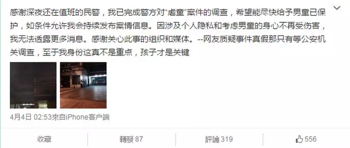 爆料網友日前兩度配合南京警方調查,並於微博表示希望警方能盡快給予男童保護,又稱自己也頂着各方的壓力。而警方則表示正調查一事,但男童現時疑與養父母到外地掃墓,不能聯絡;但此舉令網民質疑警方辦事不力,又呼籲網民將獸父母「起底」。