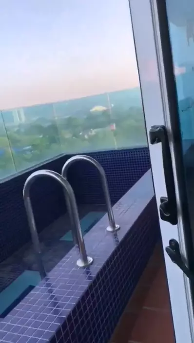 然後,肥媽再一次介紹她最愛的廚房;去到去到露台,肥媽指泳池主要是孫兒們在玩,旁邊的BBQ則可以用來招呼朋友,而露台外是開揚的山景,肥媽指因為對面是大學,所以將來應該不會有高樓大廈,不用擔心美景日後會被遮擋;而上一層則是房間,肥媽自言怕行樓梯,所有必定選擇乘升降機代步。