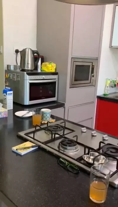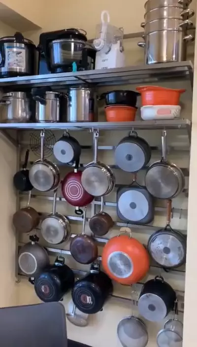 身為飲食主持,肥媽對廚房非常在意,所以她都先帶大家參觀廚房,可見廚房中應有的廚具都一應俱全,而且旁邊還有大窗戶,可以邊食飯邊欣賞美景,而肥媽最愛的地方,就是由她老公設計的「煲架」,可見每個煲、煎pan等都整齊排列,好像肥媽不用蹲下就能找到要用的廚具,她還透露這個「煲架」在香港、中山、馬拉的房子都有,是她最自豪的地方!