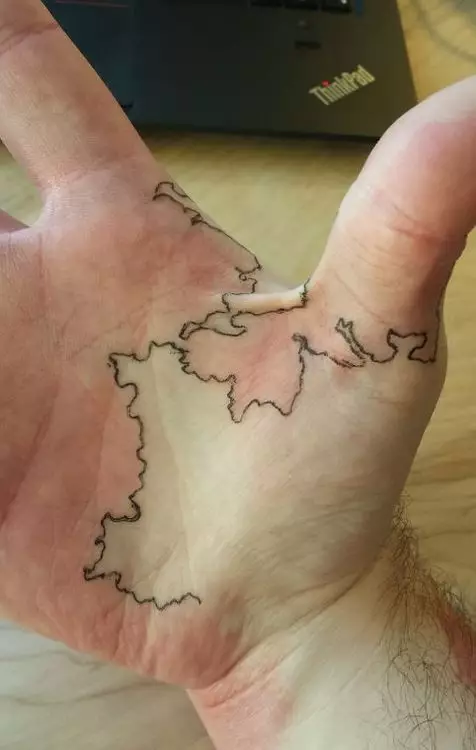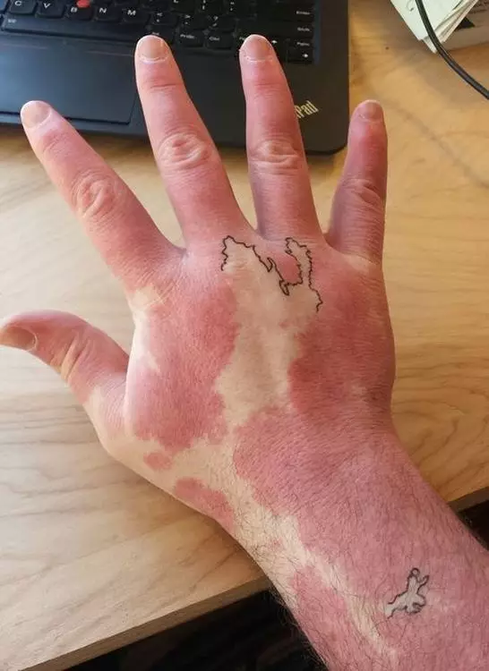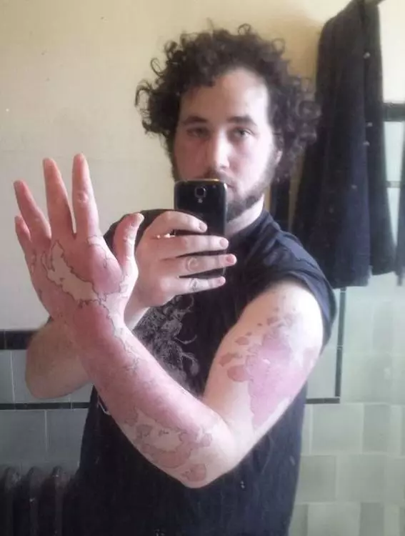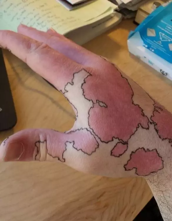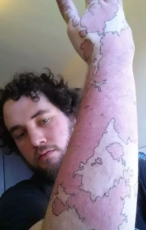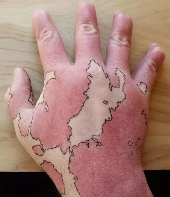 很多人都會著長袖遮掩胎記,一個美國學生右前臂亦有一大片胎記,但他卻創意十足,用筆勾畫出胎記和正常皮膚的界線,變成一幅世界地圖。
