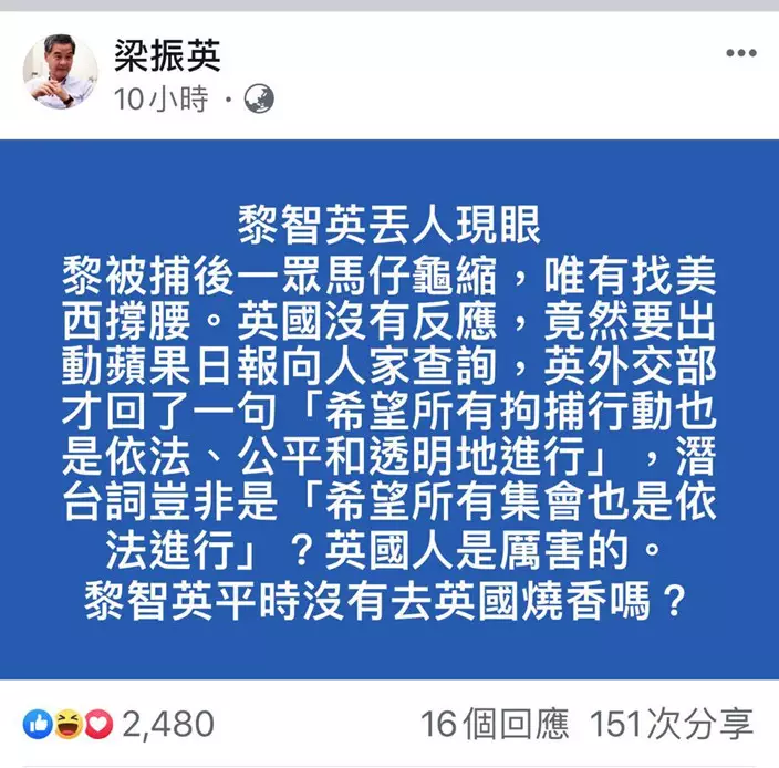 另外,前特首CY在面書踢爆,指黎智英丟人現眼,黎被捕後一眾馬仔龜縮,唯有找美西撐腰。英國沒有反應,竟然要出動蘋果日報向人家查詢,英外交部才回了一句「希望所有拘捕行動也是依法、公平和透明地進行」,潛台詞豈非是「希望所有集會也是依法進行」?