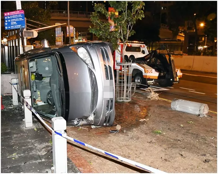 事發於凌晨1時半左右,現場為香港仔大道往田灣方向。七人車剷上行人路後,撞毀巴士站旁3條約1米高的石柱後調頭翻側,幸巴士站當時無乘客候車。