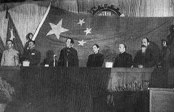 1949年首屆政協會議選舉的中央人民政府主席毛澤東等在大會主席台上