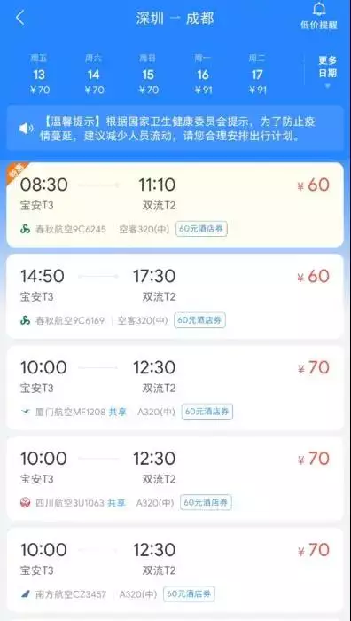 以從深圳到成都為例,從3月5日到27日,最低票價都在百元以內。其中,春秋航空的0.2折經濟艙,票價僅60元。