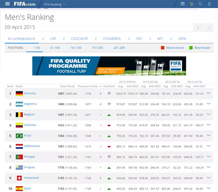 周四公佈最新一次FIFA世界排名中,應屆世界盃冠軍德國繼續排第一阿根廷第二。比利時與哥倫比亞互換位置至第三位,是歷來最高排名。巴西排第五。瑞士和西班牙雙雙重返十大,排第九和第十位。英格蘭排十四。