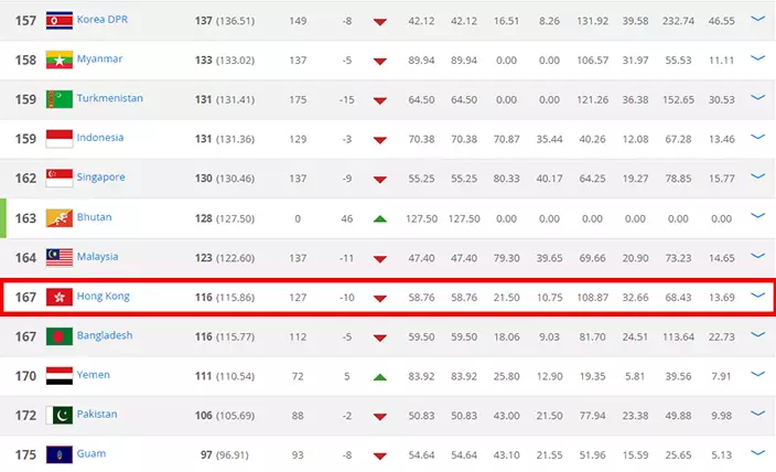 下跌10級的香港被不丹超越。(FIFA截圖)