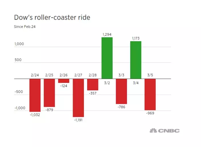 美國新冠疫情惡化,聯儲局周二無預警降息兩碼,一降就降0.5厘,創下2008年金融海嘯以來首度無預警降息,且降息幅度兩碼也是2008年以來最多。聯儲局減息後美股一日上一日落大幅波動,情況得人驚,杜指周三升1173點,周四跌969點。