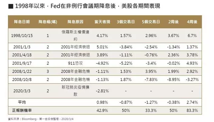 回顧過去聯儲局在非例行會議期降息的次數共有6次,加上周二是第7次,而過去在非例行會議期降息的原因,通常是在美國經濟大衰退、金融危機或重大國際金融事件時才使用。
