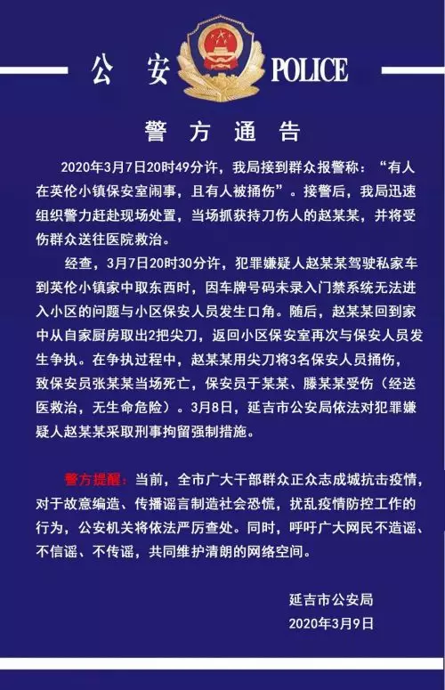 新京報快訊 延吉市公安局微信公眾號今日發佈警方通告稱,2020年3月7日,延吉市公安局接報警稱:「有人在英倫小鎮保安室鬧事,且有人被捅傷。」接警後,公安局迅速組織警力趕赴現場處置,當場抓獲持刀傷人的趙某某,並將受傷群眾送往醫院救治,並依法對犯罪疑人趙某某採取刑事拘留強制措施。通告全文如下: