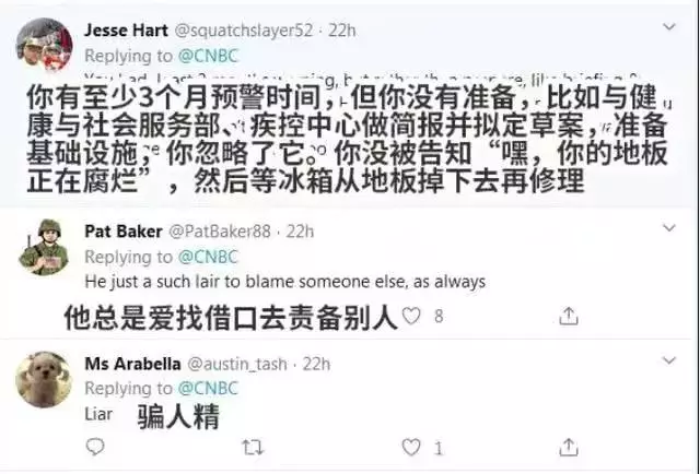 CNBC推特的留言中,不少網友指責蓬佩奧是「騙子」,還有人表示,「粉飾失敗,就玩起了推卸責任的遊戲!」