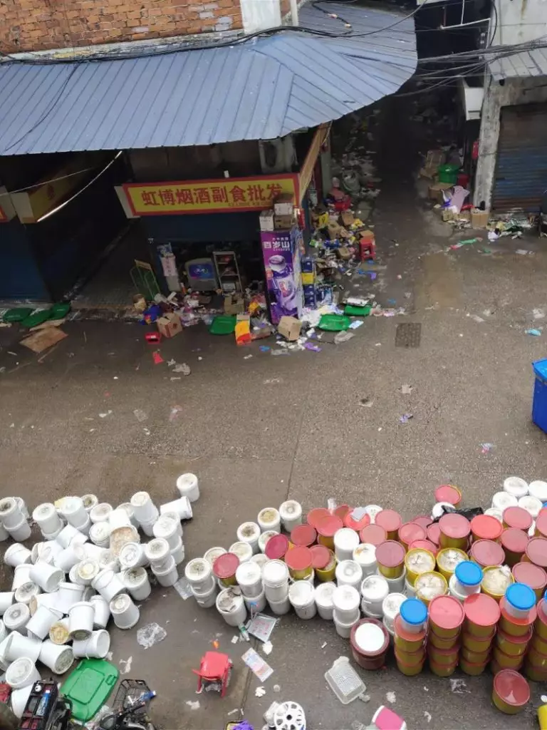 章先生是華南海鮮市場西區八街一家凍品店的負責人。3月10日,章先生髮給記者的一段近日海鮮市場東區清貨視頻顯示,有不少身穿白色防護服的工作人員從市場東區二樓的倉庫里將貨物拉出,成箱未拆封的貨品堆放倉庫附近的空地上。有工作人員將紙箱、泡沫箱拆開後把貨品扔進準備好的塑料桶中。