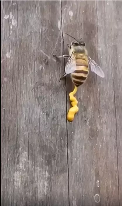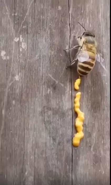 一直有網上謠傳蜂蜜是蜜蜂的「便便」,但這種說法是錯誤的。但究竟蜜蜂的排泄物是點樣呢?一位網民就意外直擊到蜜蜂「開大」,從網民拍攝到的影片見到,一隻蜜蜂一訪邊爬行一邊從下腹排出金黃的糊狀物,好像在擠「黃色芥末醬」一樣,排出的量相當多。