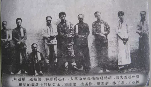 廣州起義失敗,清廷殘酷捕殺革命黨人,右起為羅聯、饒輔廷、羅遇坤、陳亞才、宋玉林、韋雲卿、徐滿凌、梁緯和、徐亞培等烈士就義的情形(資料圖)