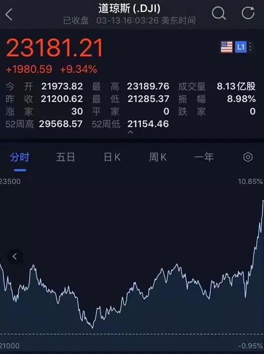 不過在尾盤,美股出現了超級大逆轉,當時特朗普舉行記者會,宣佈多項措施應對疫情,美股直線飆升,三大股指均漲超9%。